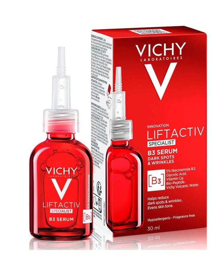 B3 koyu leke ve kırışıklık karşıtı serum, Vichy volkanik suyu, Niasinamid içerir.